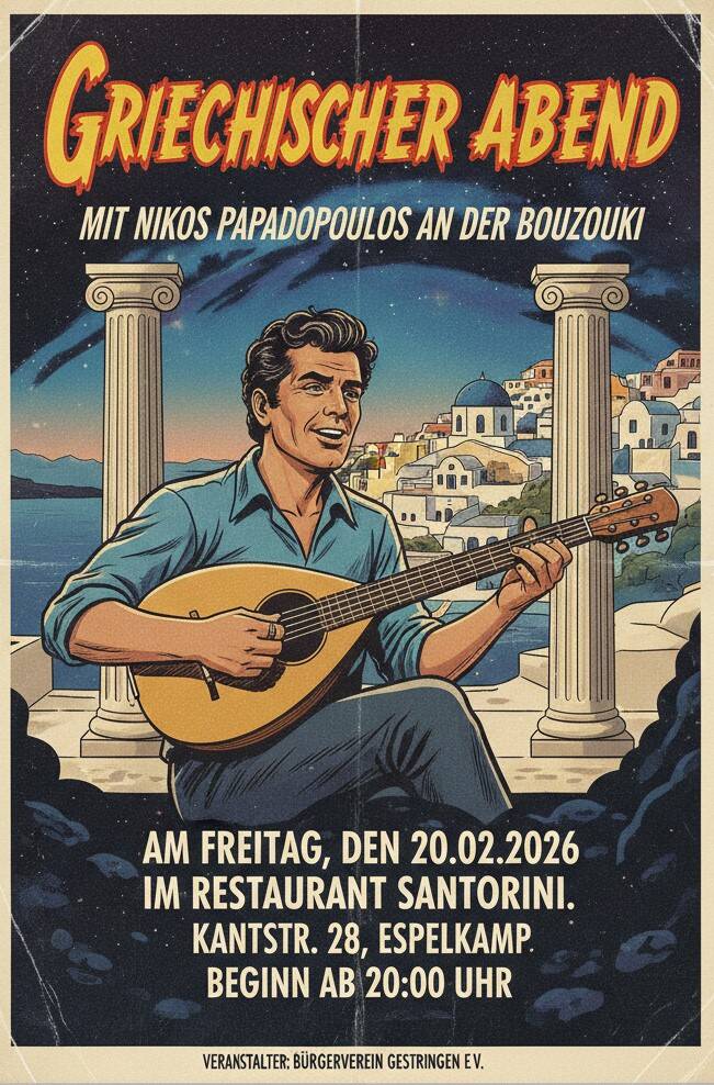 Das Jubiläumsjahr eröffnet der Bürgerverein mit einem Griechischen Abend in Zusammenarbeit mit dem Restaurant Santorini in der Kantstraße 28 im Zentrum von Espelkamp.